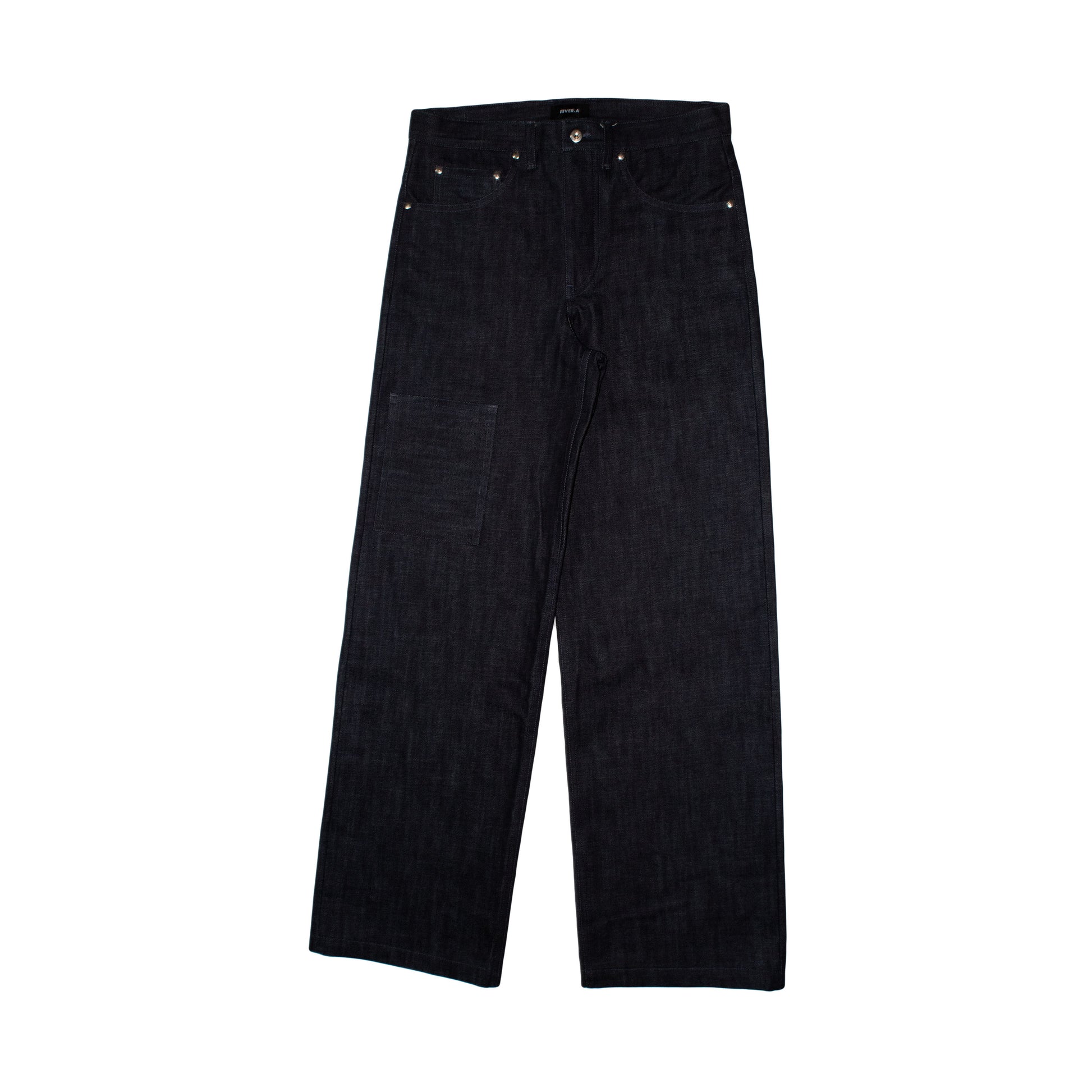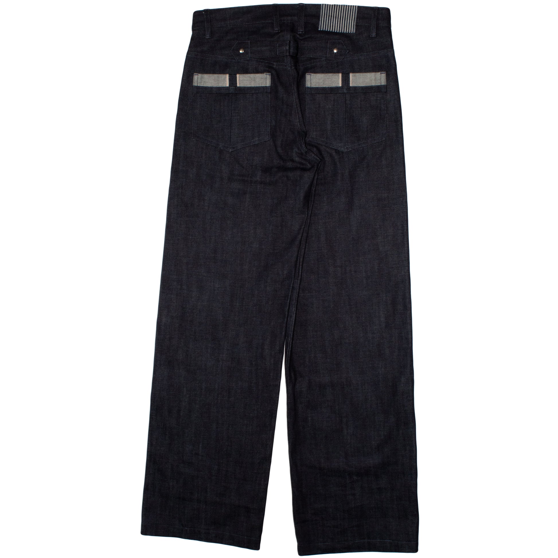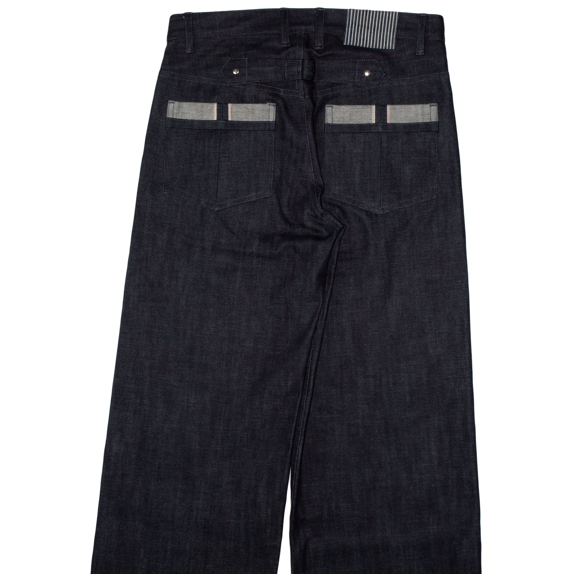 Cut in a classic five-pocket silhouette, these jeans are made from dead stock Italian selvedge denim. The rear buckle detail allows for slight waist adjustment while nodding to vintage tailoring. Patch pockets are positioned to expose the selvedge edge.