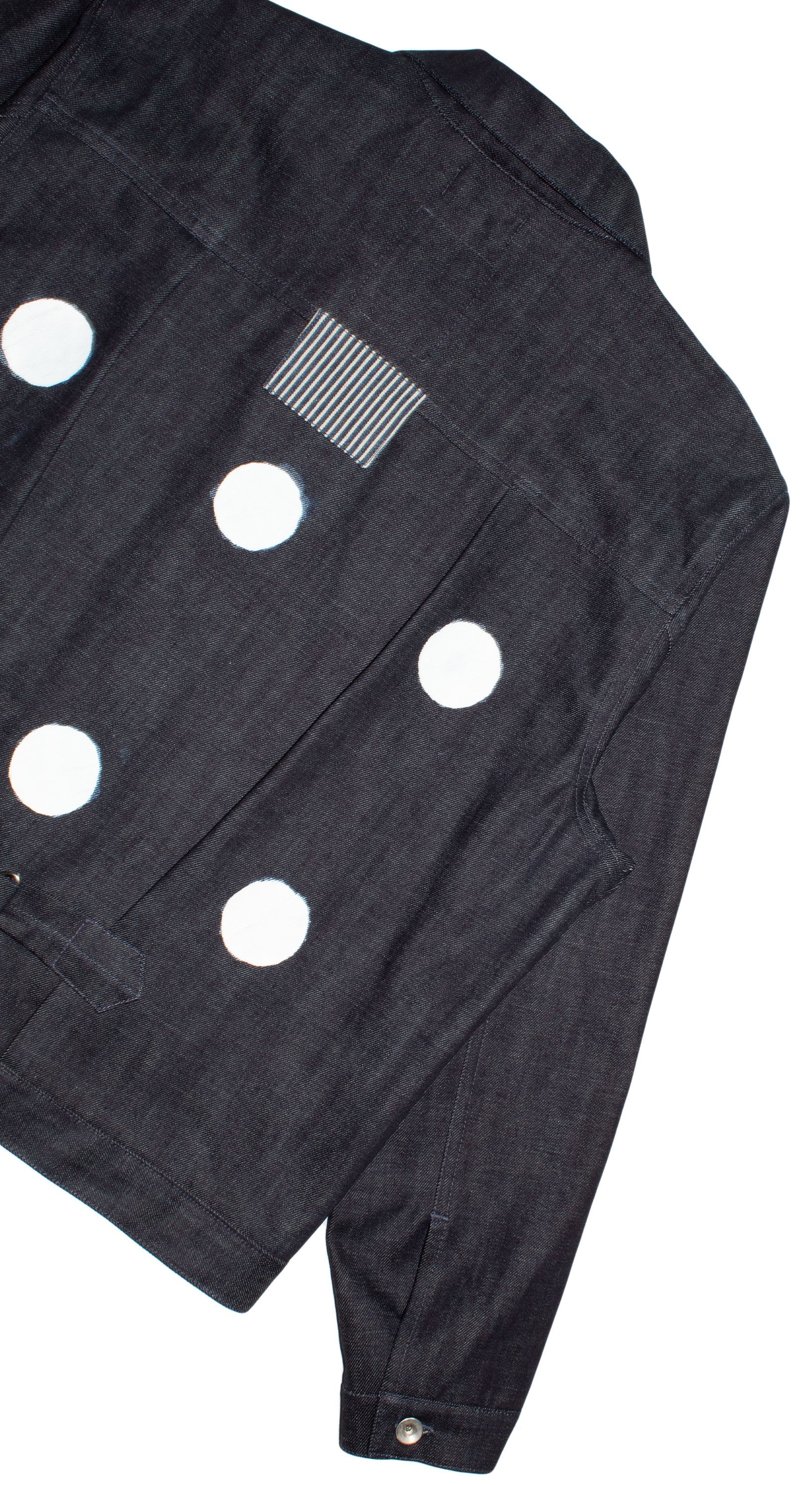 The denim jacket blends legacy and reinterpretation. It features seam pockets paired with small patch pockets and a traditional buckle detail at the back. A hand-painted design along the rear panel introduces individuality, crackling and fading with time as the denim wears.